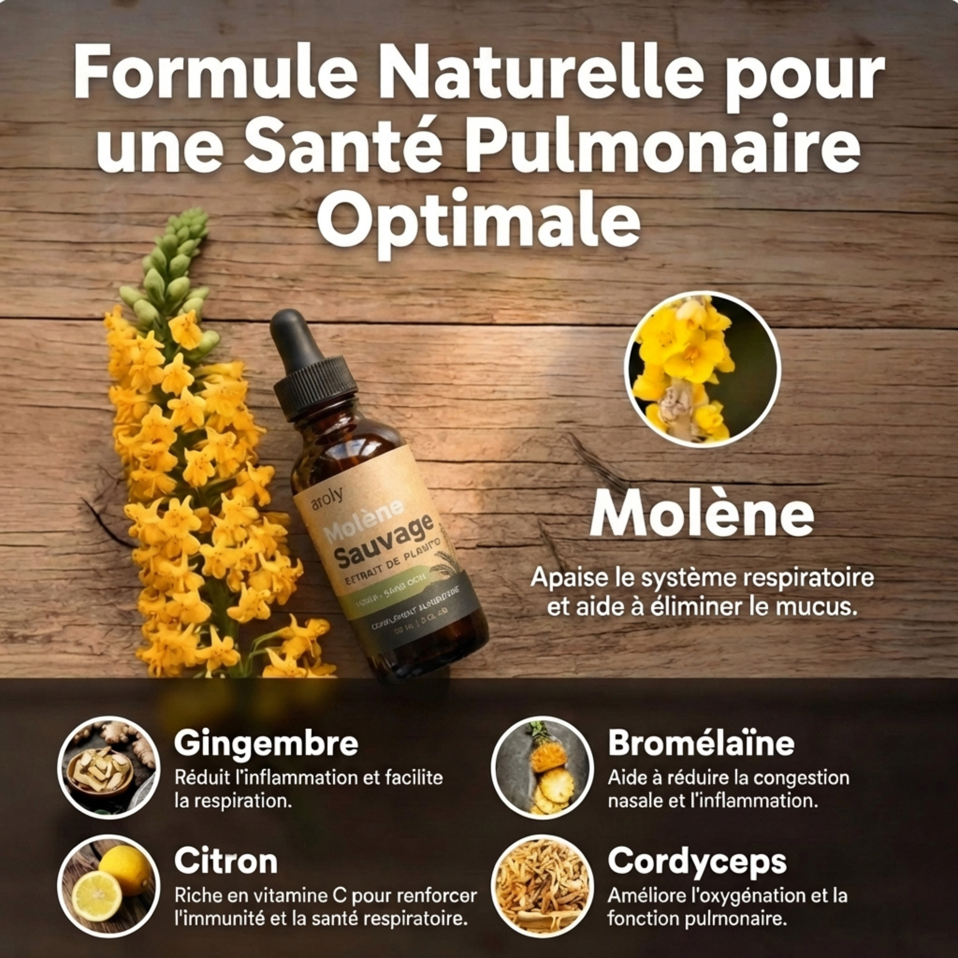 La plupart des compléments pulmonaires sous-dosent la molène — la seule plante qui nettoie vraiment en profondeur. AROLY contient un extrait liquide ultra-concentré de molène sauvage, pas de poudres faibles, pas de charges inutiles.