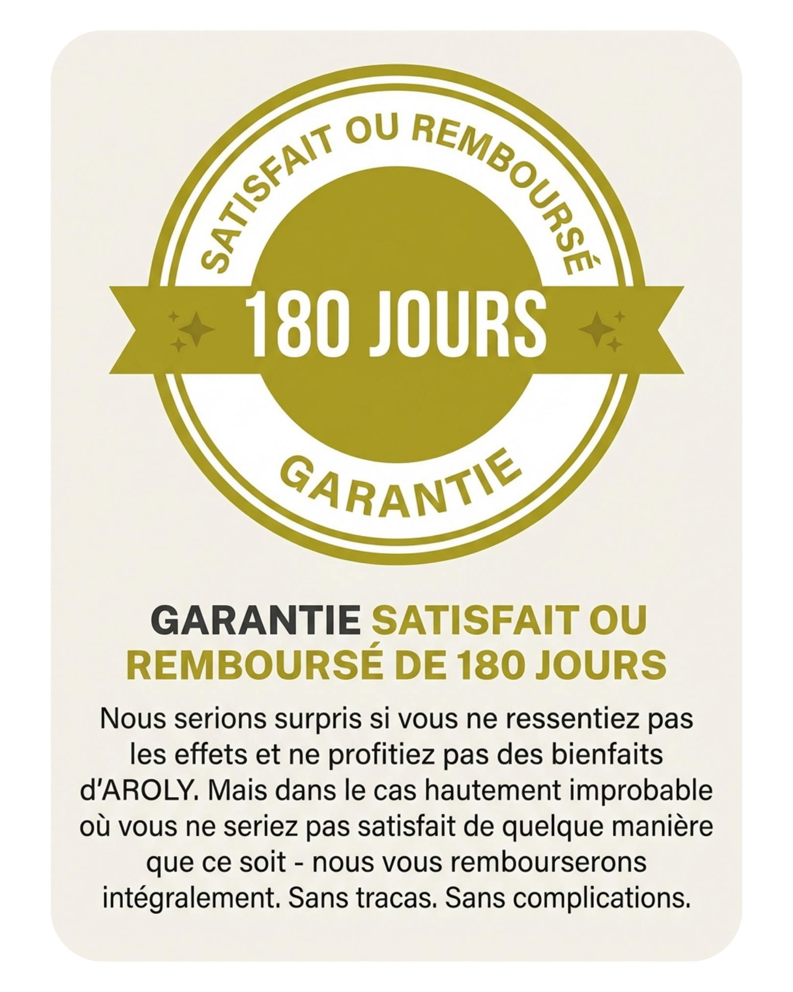Livraison gratuite sur toutes les commandes. Garantie satisfait ou remboursé de 180 jours — sans questions, sans tracas. Si vous n'êtes pas satisfait, nous vous remboursons intégralement.